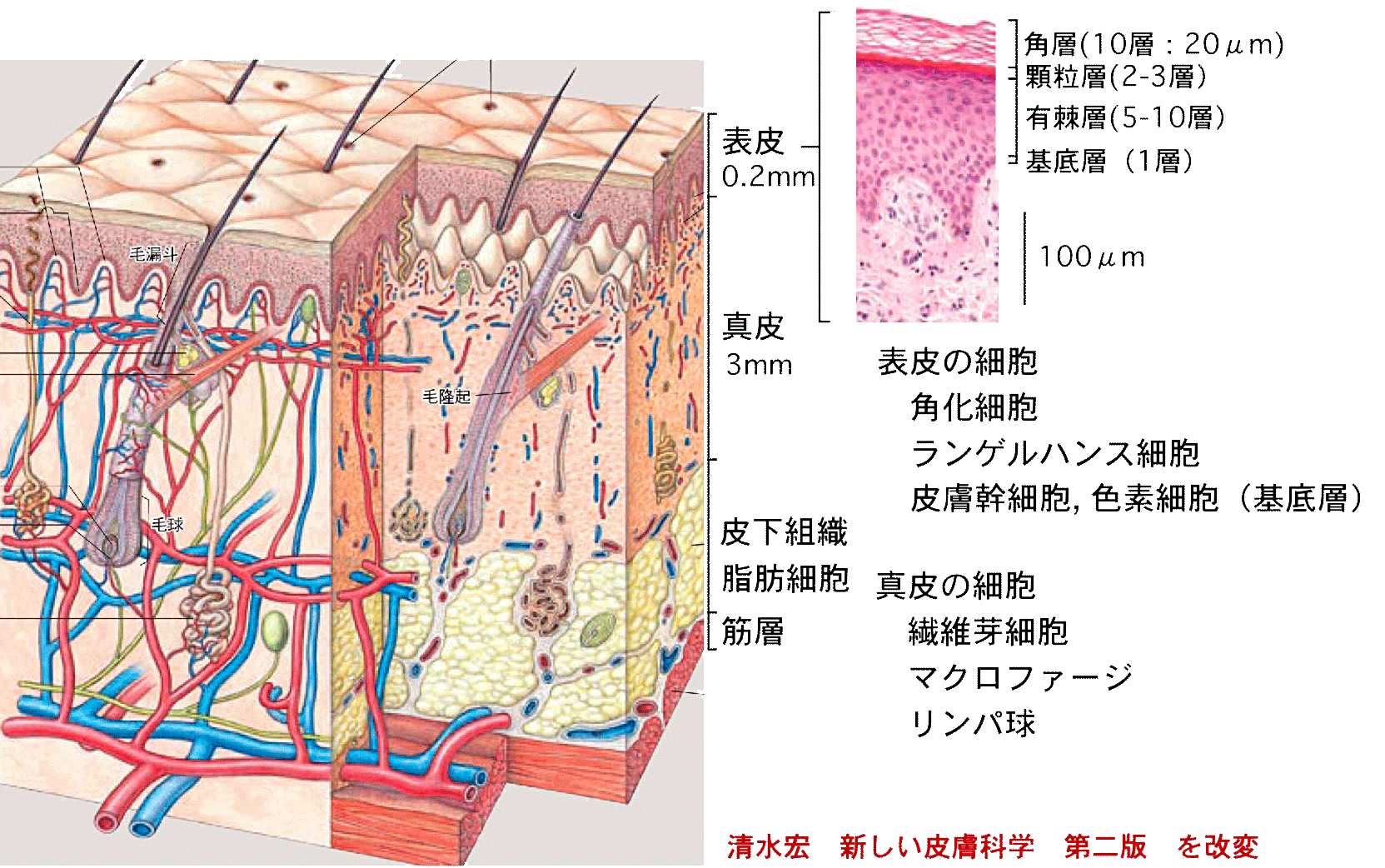 お肌の一番表面の表皮は外界との境目としてさまざまな外敵から体を守るバリヤーの役目があります。表皮を形成しているのが「角化細胞」という細胞です。角化細胞は表皮の最下層にある皮膚幹細胞から発生し、成長につれて上の細胞を押し上げて皮膚の表面へと上昇し、最後は死んで角層を形成し、皮膚表面から垢としてはがれ落ちていきます。肌はこうして約4週間周期で新しい細胞と入れ替わることで、みずみずしさを保っています。